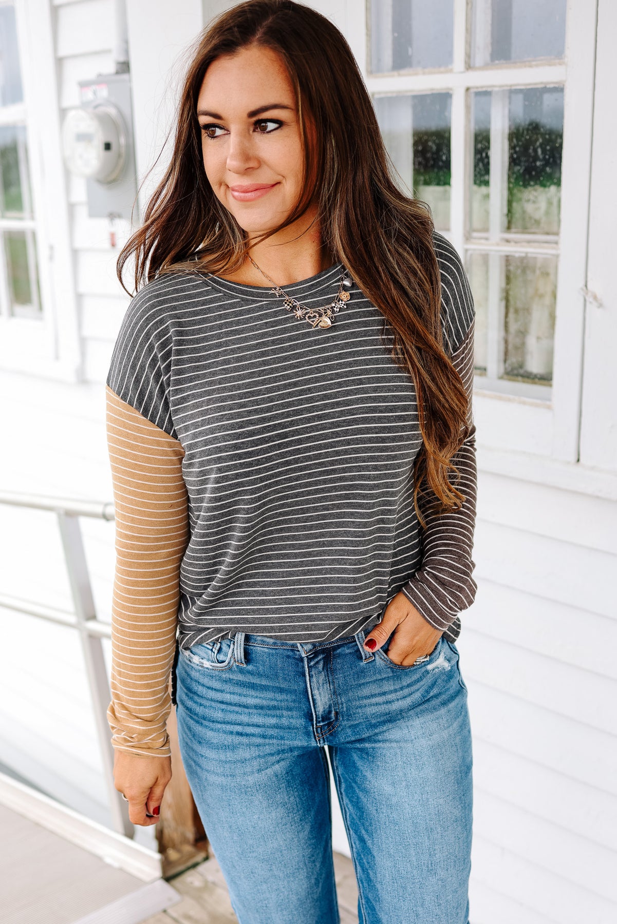 Julia Striped Colorblock Sleeve Top - Charcoal