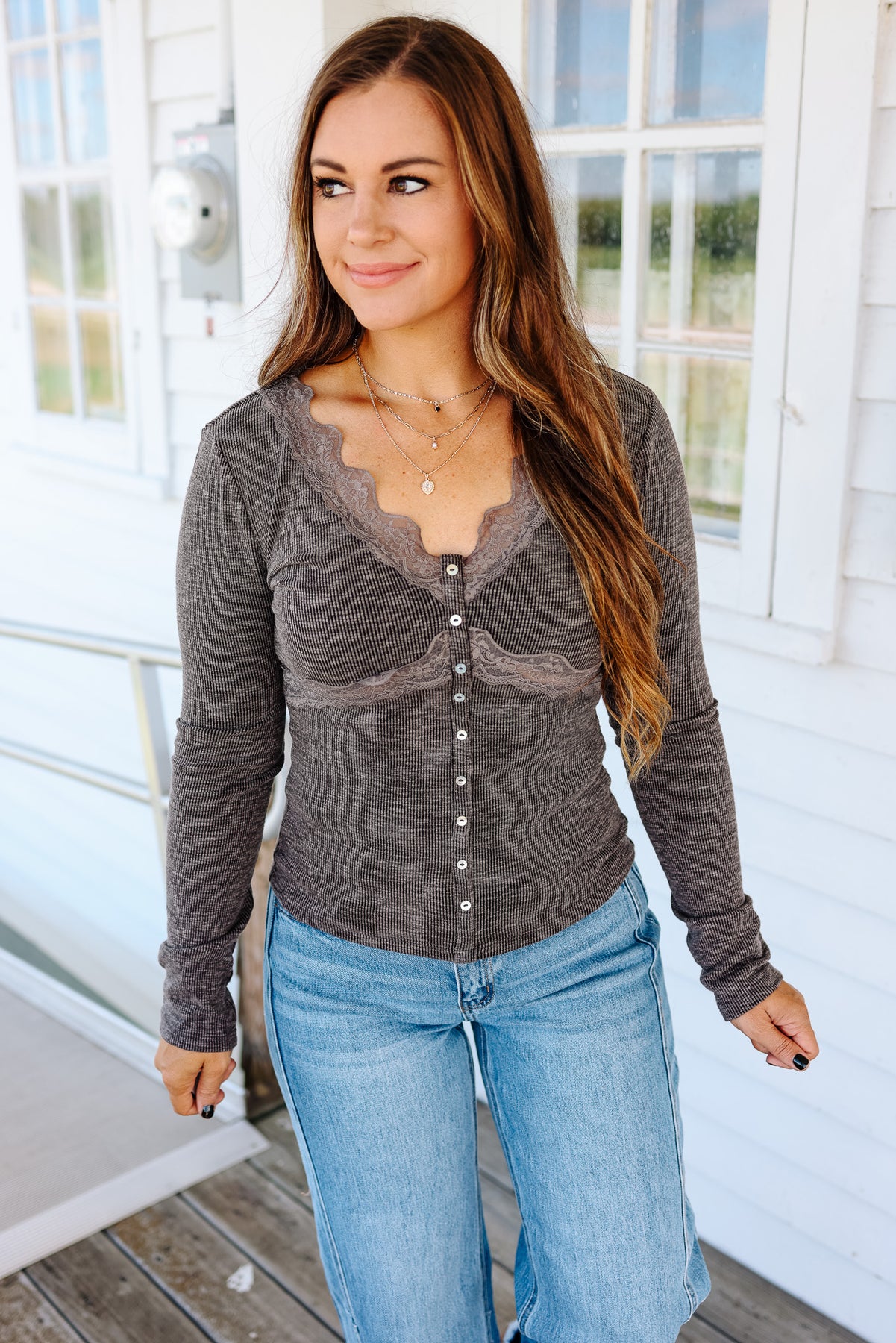 Bowie Lace Ribbed Top - Washed Black