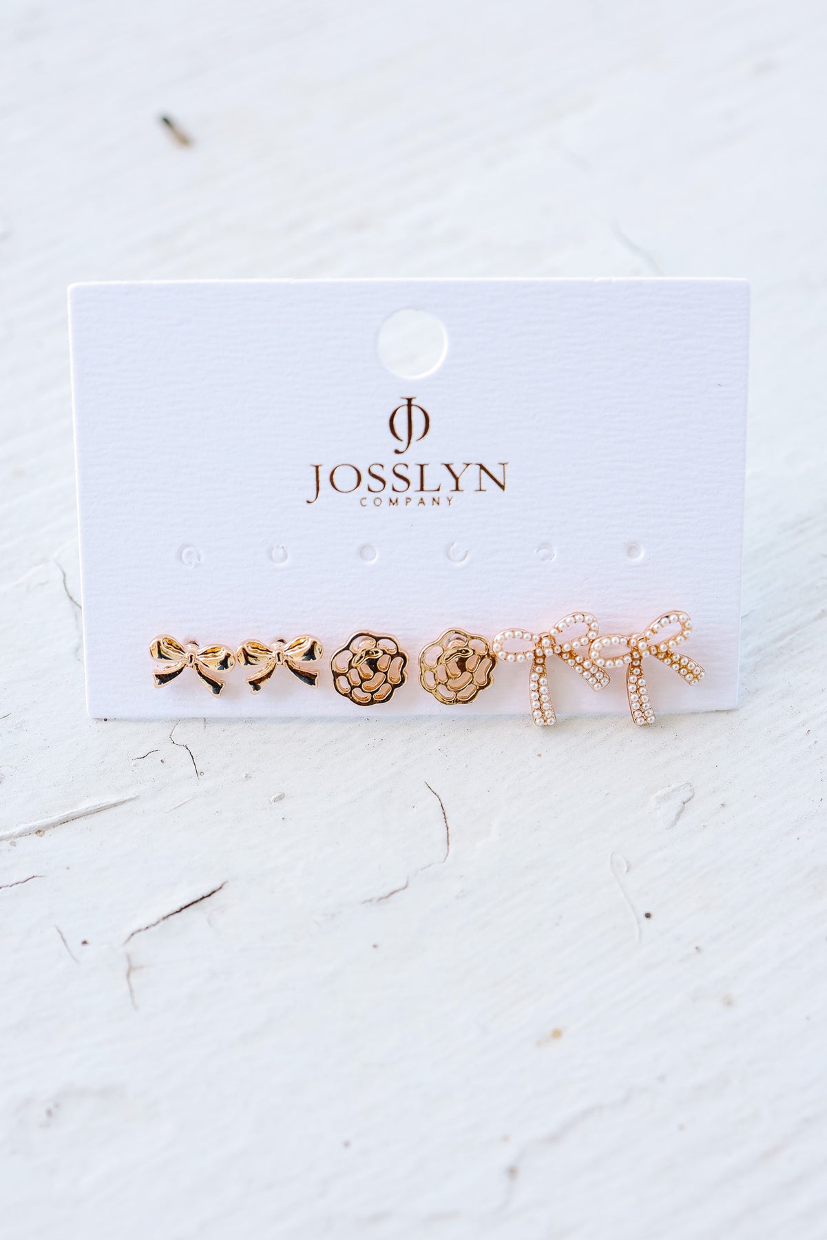 Trio Stud Bow Floral Pearl Earrings Set is a charming collection of three delicate designs, featuring a dainty bow, a petite flower, and a classic pearl.
