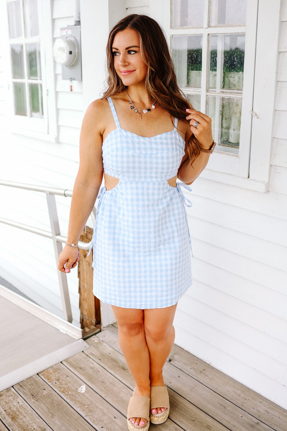 Gingham Sweetheart Neck Dress - Baby Blue